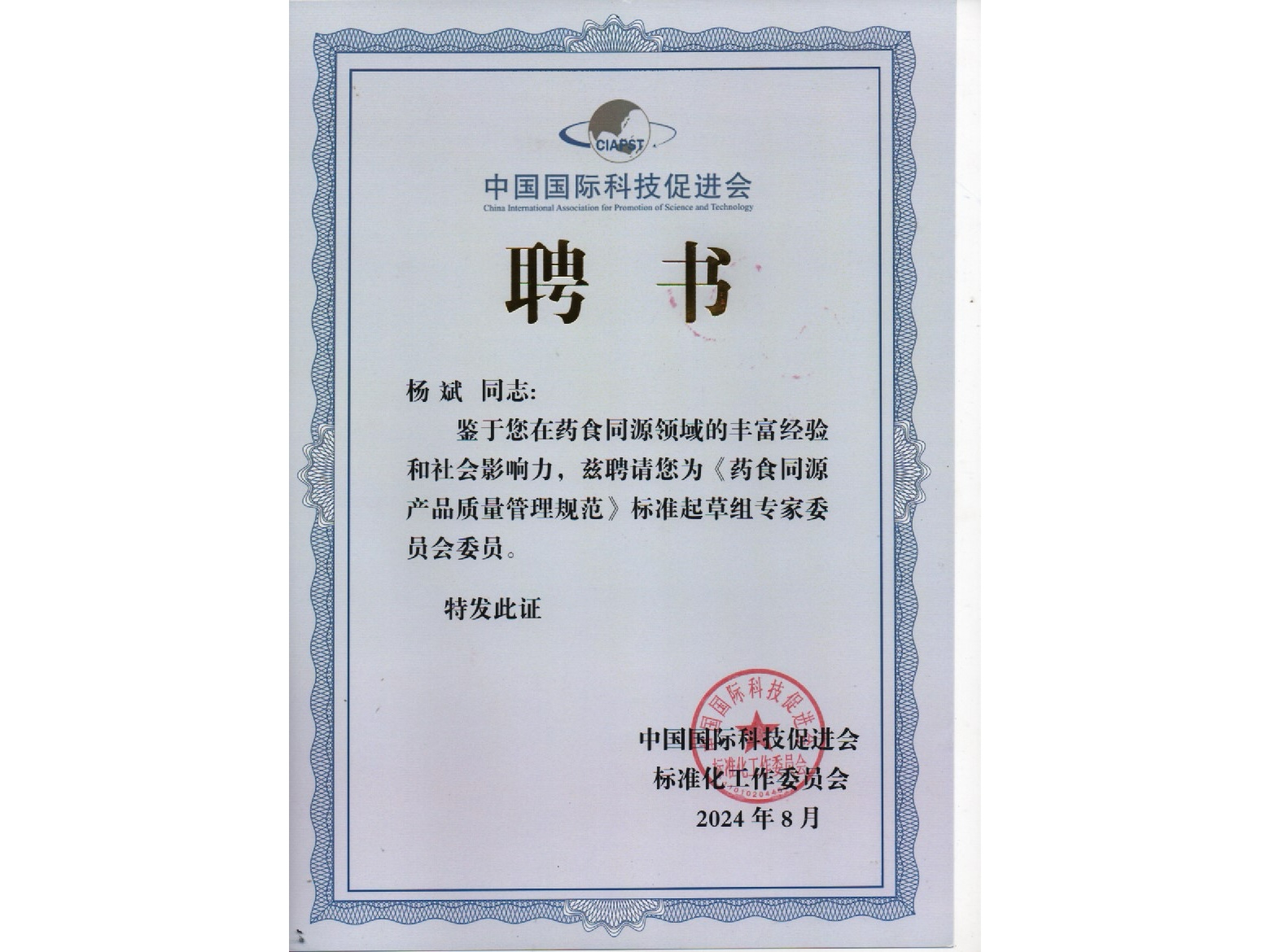 中国国际科技促进会聘书